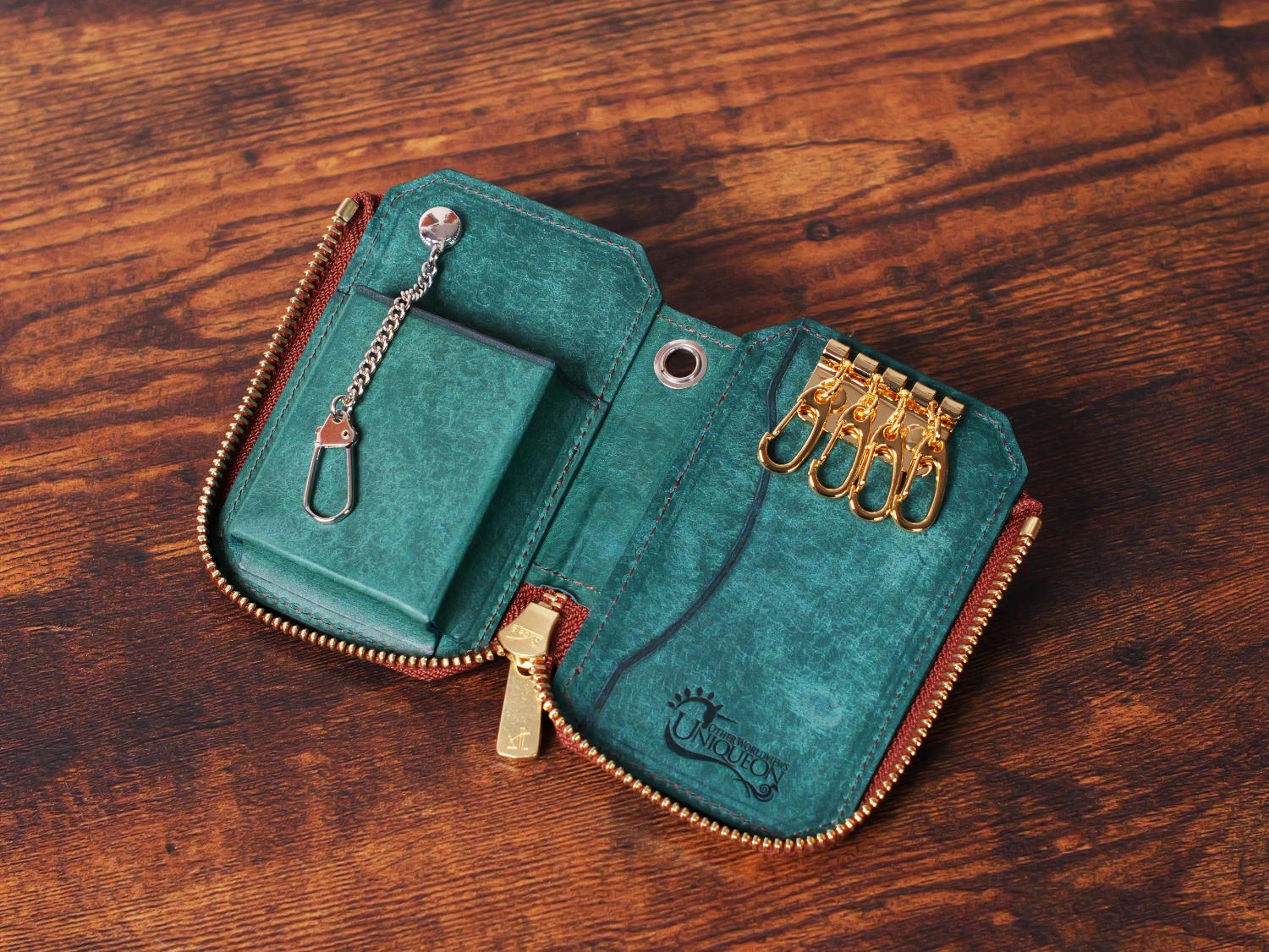4連キーチェーンとファスナーにゴールドカラーを採用し、優雅で気品のあるヨーロピアンスタイルに仕上げております。